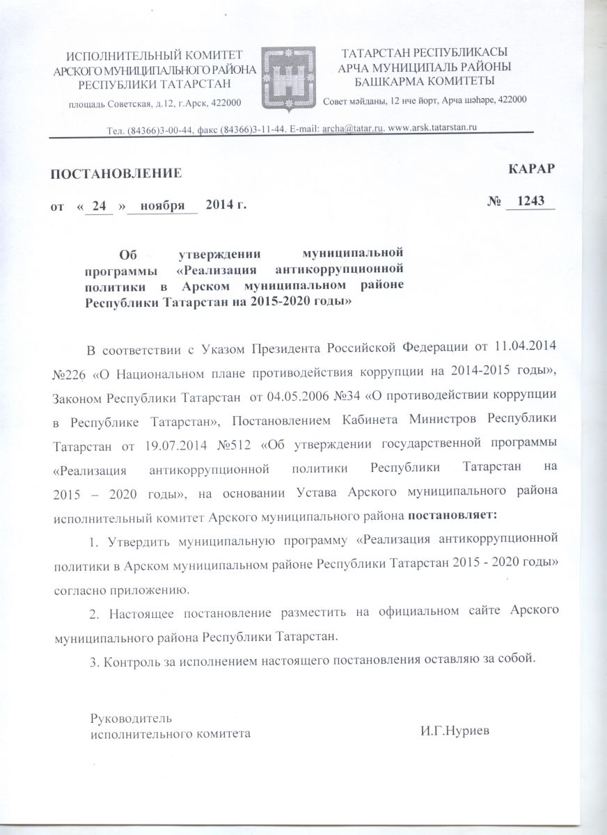 Комплексная антикоррупционная программа Арского муниципального района РТ на 2015-2020 годы