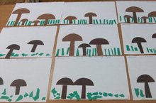 Максат:Балаларның образлы күзаллау сәләтләрен үстерү.Түгәрәк һәм овал формаларын аеру.Аларны урталай кисеп ,гөмбә формасын алырга өйрәтү,матур композиция төзетү.Яшел төсле кәгазьдән ,кайчы белән кисү һәм ерту алымын кулланып ,чирәм ,мүк ябыштырырга өйрәтү.Келәй белән чиста,пөхтә эшләү күнекмәләрен ныгыту. -