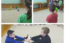 Максат :Игътибарлылык,төгәллек,җитезлек,татулык тәрбияләү.Кечкенә шарны уң һәм сул кул белән җилкә турысыннан(2м) ыргытып,кеглиларны егу күнекмәсен ныгыту.Предметлар арасыннан аяк очында йөрү,тигезлек саклау күнекмәләрен үстерү.Өйрәнгәннәрне ныгыту.Хәрәкәтле "Кем көчле?" уены оештыру.