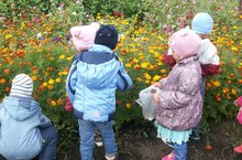 Бүген без "Көз күчтәнәчләре" дигән проект буенча яшелчә бакчасында күзәтүләр алып бардык.Бушап калган түтәлләрдә нәрсәләр үсүен искә тәшердек.Ә чәчәкләрнең көз көне дә ничек матур булып үсүләрен ,чәчәкләргә кунган күбәләкләрне, бал кортларын күзәттек.Көннең җылы ,матур булуына сокландык.