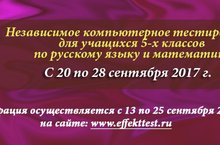 С 20-28 сентября 2017 года для учащихся 5-х классов общеобразовательных организаций Российской Федерации проводится независимое компьютерное тестирование по русскому языку и математике (далее – Тестирование).Тестирование входит в перечень мероприятий инновационного Проекта «Независимая диагностика качества обучения школьников», реализуемого с 2015 года всероссийским научно-методическим журналом «УПРАВЛЕНИЕ КАЧЕСТВОМ ОБРАЗОВАНИЯ: теория и практика эффективного администрирования» совместно с Издательством «Эффектико-пресс». Техническим оператором проведения Тестирования является Центр независимых педагогических измерений «ЭффектТест».Тестирование проводится при участии Российского государственного педагогического университета имени А.И. Герцена, на базе которого разработаны контрольно-измерительные материалы с учетом требований ФГОС.Участие образовательных организаций в процедуре Тестирования может быть использовано в целях организации самообследования и функционирования внутренней системы оценки качества образования, которые согласно п.3 Ст.28 Закона «Об образовании в Российской Федерации» входят в сферу компетенции и ответственности образовательных организаций.Участие в независимом тестировании осуществляется только на добровольной основе (с согласия родителей). Порядок регистрации, подробные условия участия, а также спецификация тестовых заданий размещены на сайте технического оператора www.effekttest.ru.Регистрация общеобразовательных организаций для участия школьников 5-х классов в независимом компьютерном тестировании по русскому языку и математике осуществляется с 13 по 25 сентября 2017 года. -