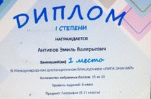 Ученик 6 -го класса Антипов Эмиль участвовал в Международном дистанционном блицтурнире «Лига знаний» по географии.