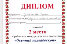 Конкурскта-икенче урын яуладык. 03.11.2016 Күптән түгел булып узган "Көзге колейдоскоп"конкурсында безнең балалар бакчасында тәрбияләнүче Сулейманова Иделия "Иңэ яхшы картина "номинациясендә 2 нче урынны яулады.