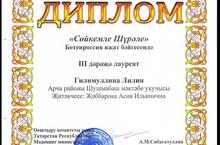 Республика Мәдәният министырлыгы уздырган Габдулла Тукайның "Сөйкемле Шүрәле" конкурсында 5 нче сыйныф укучысы Гилимуллина Лилия 3 нче дәрәҗә диплом лауреаты һәм истәлекле бүләккә лаек булды. Җитәкчесе Яббарова Асия Ильинична. Котлыйбыз !!!