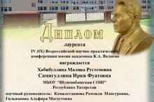 Мәктәбебез укучылары Сәмигуллина Иркә һәм Хәбибуллина Мәликә академик К.А. Вәлиев исемендәге IV бөтенроссия фәнни-гамәли конференциясендә катнашып лауреат дипломы белән бүләкләнделәр. Җитәкчеләре : Гильванова Альфира Масхутовна, Камалетдинова Рәмзилә Мансуровна.