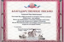Учащиеся нашей школы Рамзиль Ахметзянов, Нияз Гусманов, Дина Ахмадиева, Радиль Загафаров, Булат Гатиятуллин, Ильсаф Камалов, Халил Мингазов, Нафиса Мингазова, Инзиля Васильева, Илзия Хусаинова, Ралия Котдусова, Салават Файзрахманов за участие в конкурсе "Победа деда-моя свобода" награждены Благодарственными письмами от начальника отдела (военного комиссариата РТ по Арскому и Атнинскому районам) Бурганова Алмаза Агзамовича, а коллектив школы под руководством директора школы Абдуллина Марса Миннехановича награжден Благодарственным письмом от Военного комиссара Республики Татарстан генерал-майора Погодина Сергея Николаевича. Поздравляем всех с данными награждениями!!!