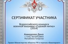 Ученица 8 класса Дина Ахмадеева удостоена специального приза и именного сертификата за активное участие во Всероссийском конкурсе военной вышивки "Суровая нитка". Проект посвящается к 70летию Великой Победы и был организован Министерством обороны Российской Федерации и Интернет-порталом "Воентернет". Мы искренне поздравляем Дину и желаем дальнейших творческих успех! Руководитель проекта-учитель технологии Зилия Зарипова.