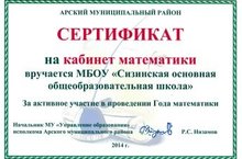 Школа награждена сертификатом на кабинет математики за активное участие в проведении Года математики.
