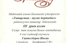 Мәдәният елына багышлап үткәрелгән "Татарстан - туган йортыбыз" районкүләм иншалар бәйгесендә III урын алган 4нче сыйныф укучысы Гаптелбәров Инсаф Мәгариф идарәсенең Мактау грамотасы белән бүләкләнде. Укытучысы-Загафарова Г.Ф.