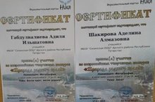 Экологик белем көне кысаларында үткәрелгән “Туган ягым табигате ” бөтенроссия иҗади конкурсында катнашып, 6 нчы класс укучылары Шакирова Аделина, Габделвәлиева Адилә сертификат белән бүләкләндeләр.