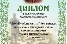 "Без-Тукайлы халык" дип аталган телевизион конкурста актив катнашканы өчен Нигматуллина Иделия "Саба дулкыннары" телерадиокомпаниясе дипломы белән бүләкләнә.