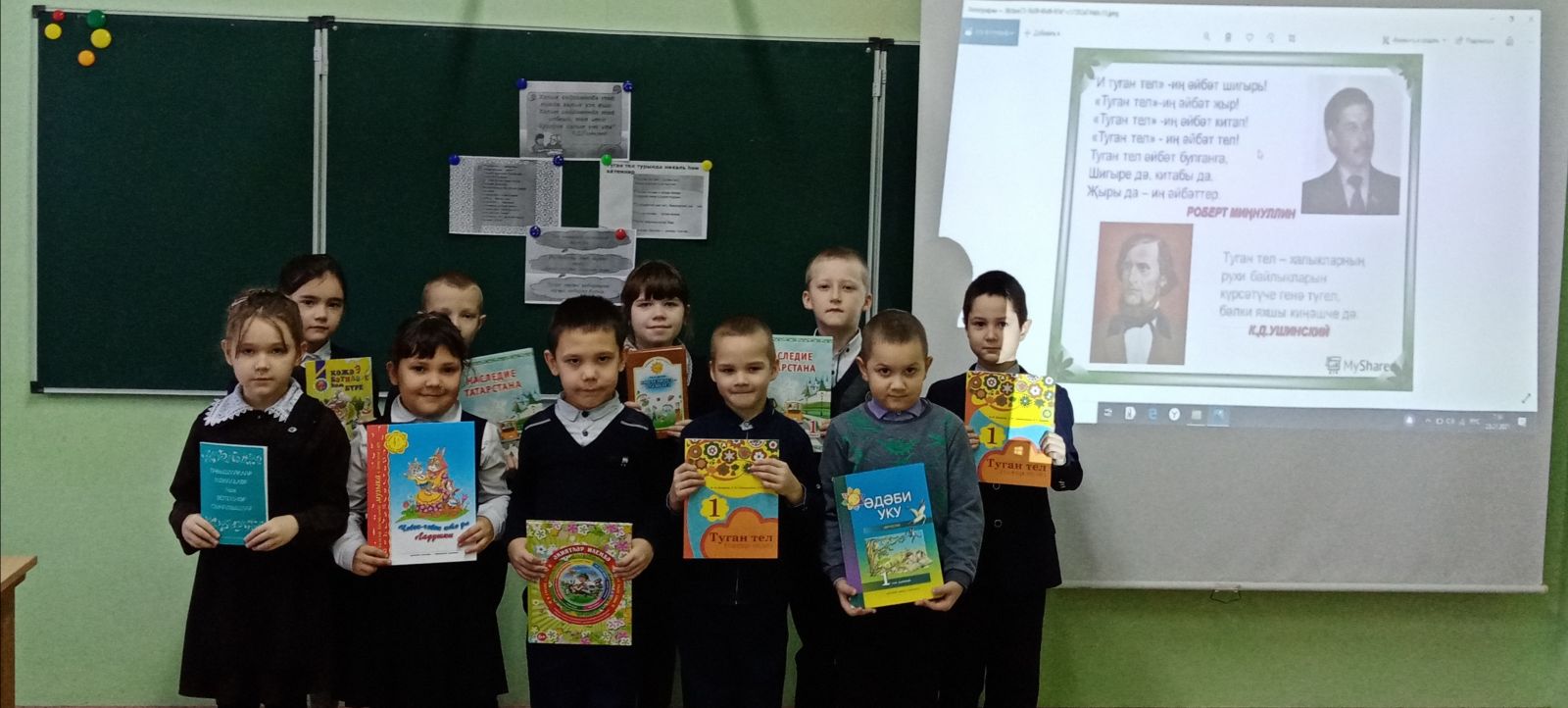 1 нче сыйныфта туган телгә багышланган сыйныф сәгате узды. Укучылар туган телебезгә багышланган шигырьләр, мәкаль-әйтемнәр, күренекле шәхесләрнең (К. Ушинский, Г. Бәширов, Ф. Яруллин, Ш. Галиев һ.б.) тел турында фикерләре белән таныштылар, җырлар тыңладылар. Тәмле телле булуның серләре белән дә уртаклаштылар һәм телебездәге матур сүзләрне барладылар.
