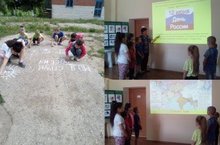 К празднованию Дня России в пришкольном лагере «Дети Солнца» с детьми была проведена познавательная игра-викторина «Я люблю тебя, Россия!», конкурс рисунков на асфальте «Моя страна Россия».