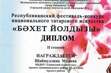 Наша воспитанница участвовала в Республиканском фестиваль-конкурсе национального татарского искусства "Бәхет йолдызы" и была награждена дипломом за 2 место. Поздравляем!