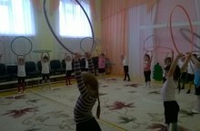 На занятии по физической культуре воспитанники старшей группы выполняли упражнения с обручем. Такие упражнения развивают гибкость, силу, координацию движений, чувство ритма, укрепляют вестибулярный аппарат, а также тренируют и развивают мышцы рук, плеч, спины и ног.