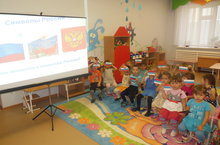 На занятии по формированию целостной картины мира закрепили знания детей о родном посёлке, расширили представления о своей стране, познакомились с символами России, выполнили аппликации флага России.
