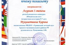 Наша воспитанница, Мухаметшина Карина, участвовала в Республиканском конкурсе для детей дошкольного возраста "Юный полиглот" посвященный Году родных языков и народного единства, и была награждена грамотой за 1 место.Поздравляем!!!!