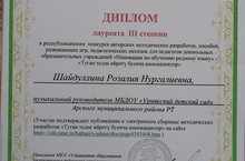 Наш музыкальный руководитель участвовала в Республиканском конкурсе авторских методических разработок, пособий, развивающих игр, педагогических находок для педагогов ДОУ "Инновации по обучению родному языку" и была награждена дипломом лауреата 3 степени. Поздравляем!