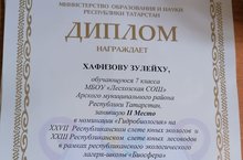 С 25 июля по 11 августа на базе структурного подразделения государственного автономного образовательного учреждения оздоровительно-образовательного комплекса «Дуслык» ГАОУ «Республиканский олимпиадный центр» МОиНРТ прошел XXVII республиканский экологический лагерь-школа «Биосфера» для одаренных детей. В смене, продлившейся 18 дней, приняли участие 72 обучающихся 6 - 10 классов из 16 муниципальных районов. В работе лагеря-школы участвовали и обучающиеся 8а класса нашей школы Хафизова З., Ахметов К. В рамках республиканского экологического лагеря-школы «Биосфера» 8 августа прошли республиканский слет юных экологов и республиканский слет юных лесоводов. В номинации «Гидробиология» Республиканского слета юных экологов и Республиканского слета юных лесоводов стала Хафизова З. стала призером (2 место). 10 августа с итогами своих исследовательских работ ребята выступали на республиканской экологической конференции. По итогам конференции в номинации «Экология растений» Хафизова Зулейха заняла 3 призовое место. Поздравляем!