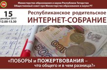 15 декабря в Казани пройдет второе республиканское родительское интернет-собрание, посвящённое вопросам противодействия проявлениям коррупции в системе образования. Начало в 12.00. Его проведет замминистра образования и науки РТ Гульнара Габдрахманова. Вопросы принимаются по электронной почте на адрес roditelirt@mail.ru — свои вопросы и предложения по теме заседания могут прислать все желающие.Онлайн трансляция заседания в течение полутора часов будет вестись на сайте Казанского инновационного университета имени В. Г. Тимирясова.