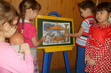 Балалар белән " Танып белү-сөйләм үстерү" эшчәнлеге барышында "Кошлар килгән җимлеккә" рәсемен карауны оештырдык. Рәсем караганда балаларда, рәсемнең эчтәлеге буенча бирелгән сорауларга дөрес, ашыкмыйча, башкалар аңларлык итеп җавап бирү күнекмәләрен үстерү, рәсемгә карап хикәя төзеп сөйләргә өйрәнүне камилләштерүне дәвам иттек. Балаларда кошларга сакчыл караш тәрбияләү, ярдәм итәргә теләк тудыру өстендә эшләдек.
