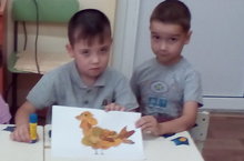 Төзү шөгылендә балалар Гөлзидә апалары белән табигый материалдан кош рәсеме ясадылар.