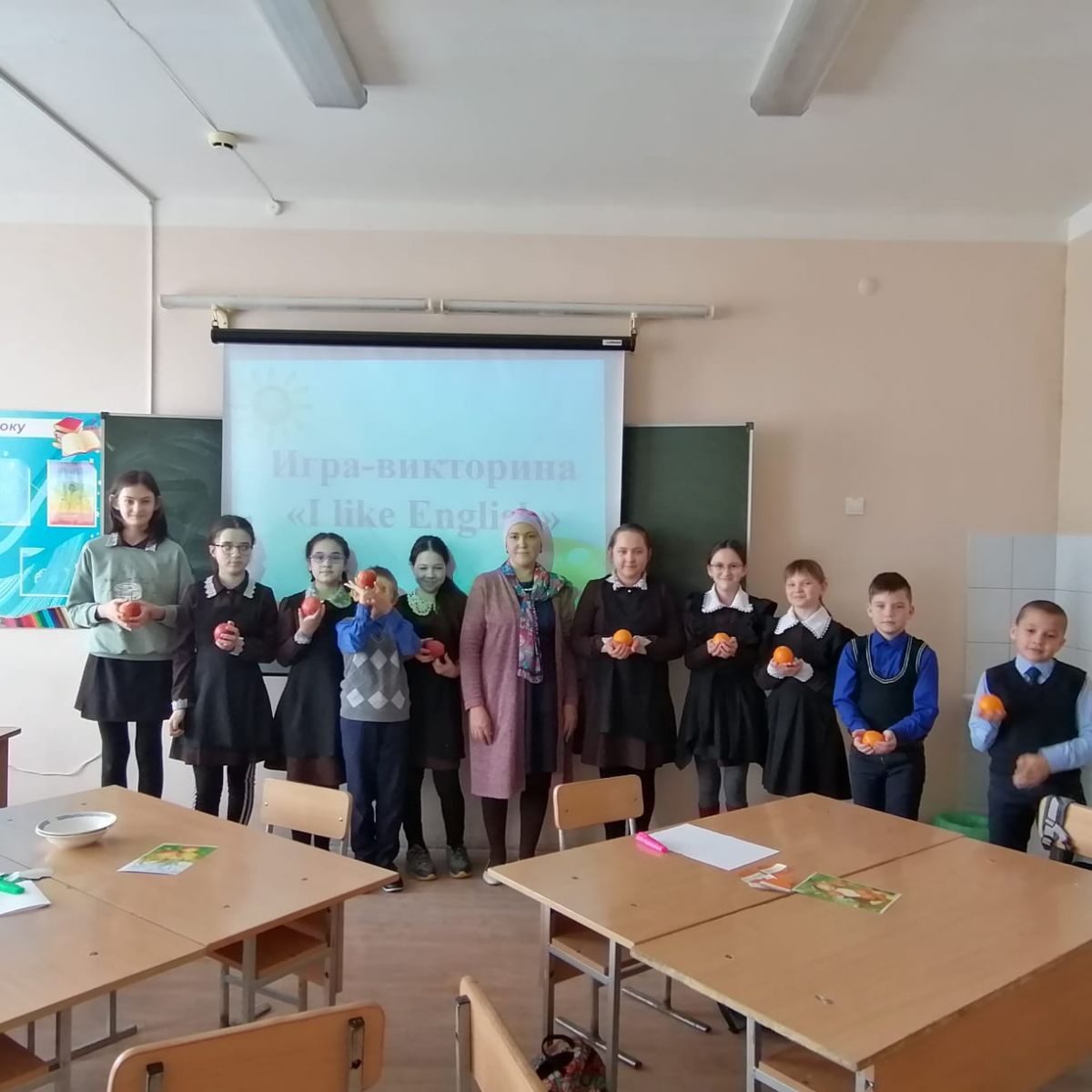 В рамках недели английского языка ( с 15- по 20 марта) Провели игру викторину " I like English" среди учащихся 4-5-6 классов. Участвовали две команды "Apples" " Oranges" ( яблоки и апельсины) Выиграла команда "Apples" яблоки.Обе команды были награждены вкусными фруктами.
