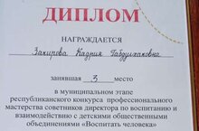 "Кеше тәрбияләү" дигән тема астында узган республика конкурсының муниципаль этабында катнашып директор киңәшчесе Закирова Кадрия 3 нче урынга лаек булды, котлыйбыз, молодцы!