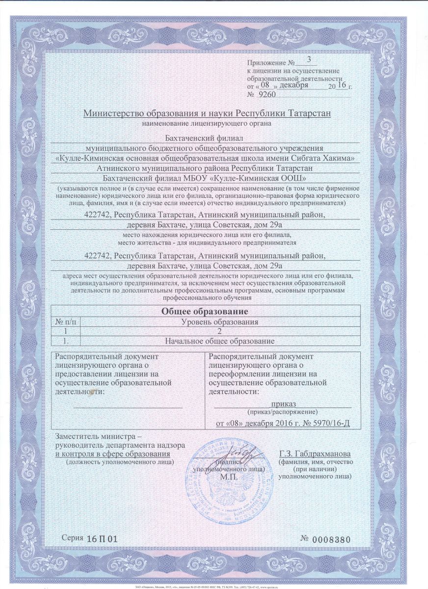 Приложение к Лицензии на осуществление образовательной деятельности (Бахтаченский филиал)