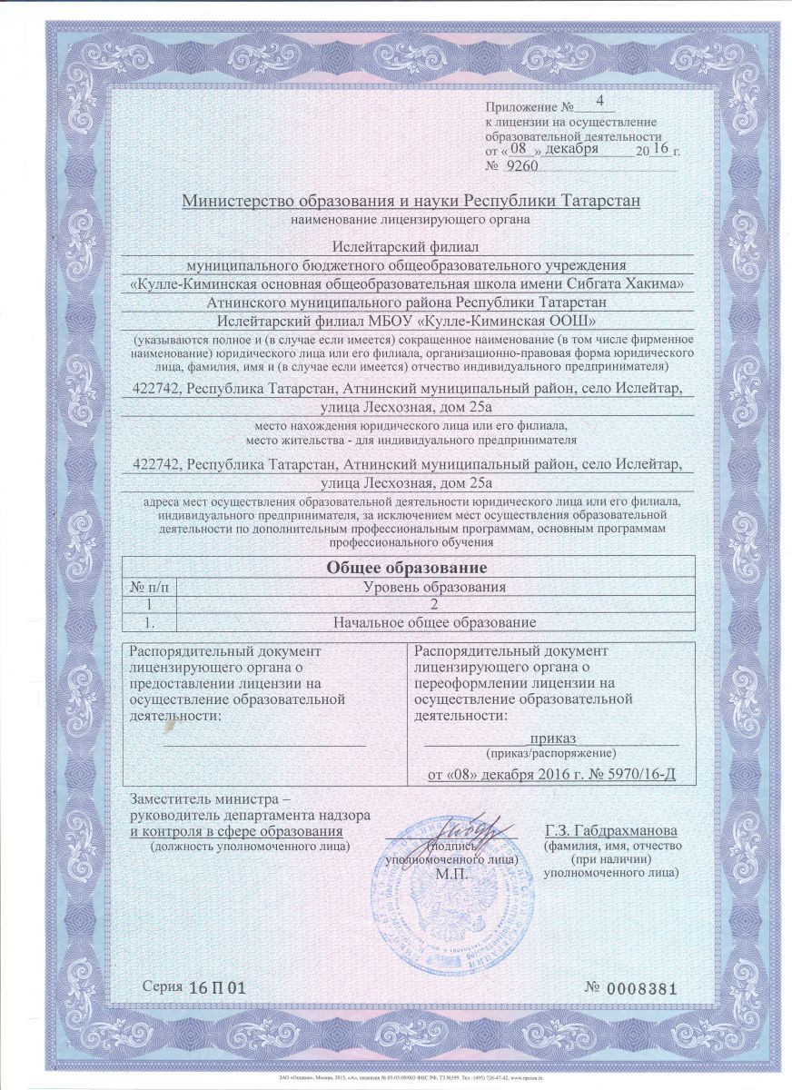 Приложение к Лицензии на осуществление образовательной деятельности (Ислейтарский филиал)