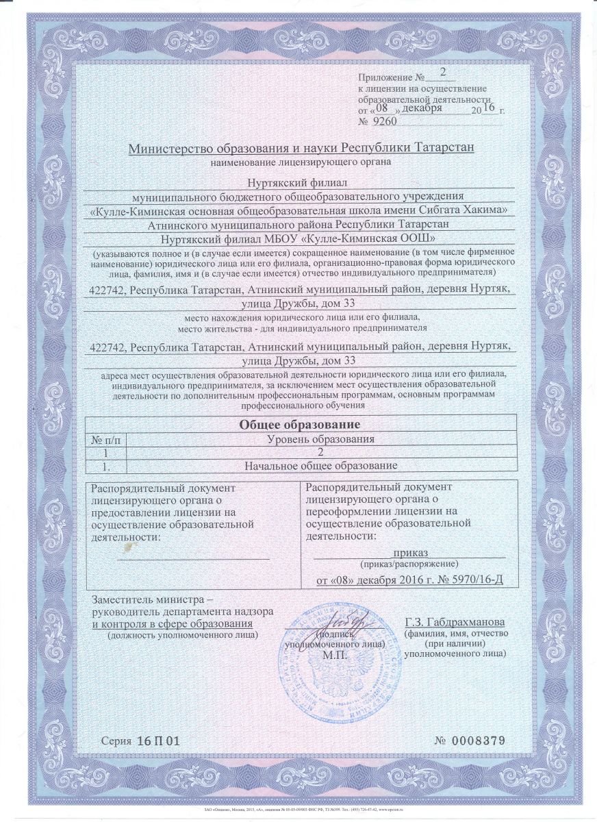 Приложение к Лицензии на осуществление образовательной деятельности (Нуртякский филиал)