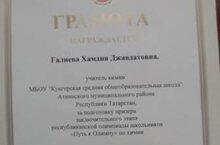 Грамота за подготовку призера заключительного этапа республиканской олимпиады школьников "Путь к Олимпу" по химии 13.01.2022