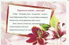 8 Март – Халыкара хатын – кызлар көне – иң якты, матур бәйрәмнәрнең берсе. Бу матур бәйрәм көннәрендә безнең ихлас котлауларыбызны кабул итегез! Бәхет, шатлык, сәламәтлек, уңышлар һәрвакыт сезнең юлдашыгыз булсын!