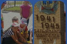 Лагерьдә "Хәтер" көне. Без бъген Бөек Ватан сугышында ятып калган авылдашларыбызны искә алып һәйкәлгә чәчәкләр куйдык, сугыш турында хикәяләр укыдык, мултьфильмнар карадык.