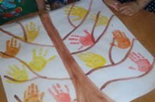 Нәни кулларыбыз белән кечкенәләр төркемендә тырыша тырыша агачка тосле яфраклар ясадык.Көзга агач болай да матур була икэн!