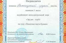 «Эрудит-клуб»ның «Казанның истәлекле урыннары» темасына багышланган турында Түбән Көек урта гомуми белем бирү мәктәбе командасы III урын яулады.