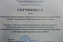 Воспитатель по обучению детей татарскому языку Гимадиева Э.У. была награждена сертификатом за участие в городском конкурсе инновационных программ, проектов и методических разработок в номинации "Дошкольное воспитание".