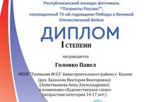 Поздравляем ученика 9 Л класса Головко Павла с победой в номинации "Художественное слово" в республиканском конкурс-фестивале "Патриоты России!", посвященном 75-ой годовщине Победы в Великой Отечественной Войне.