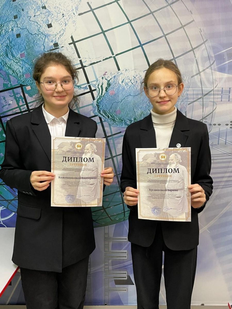 23 ноября прошла XXII Республиканская научно-практическая конференция школьников им. Л.Н. Толстого. Екатерина Кожевникова (10Б) и Хусаинова Зарина (8Б) по результатам конференции награждены Дипломами I степени в секциях «Работы, посвященные Году семьи» и «Работы, посвященные книгам-юбилярам». Поздравляем наших победительниц и учителей русского языка и литературы Большакову Е.В. и Гарифуллину Э.И.