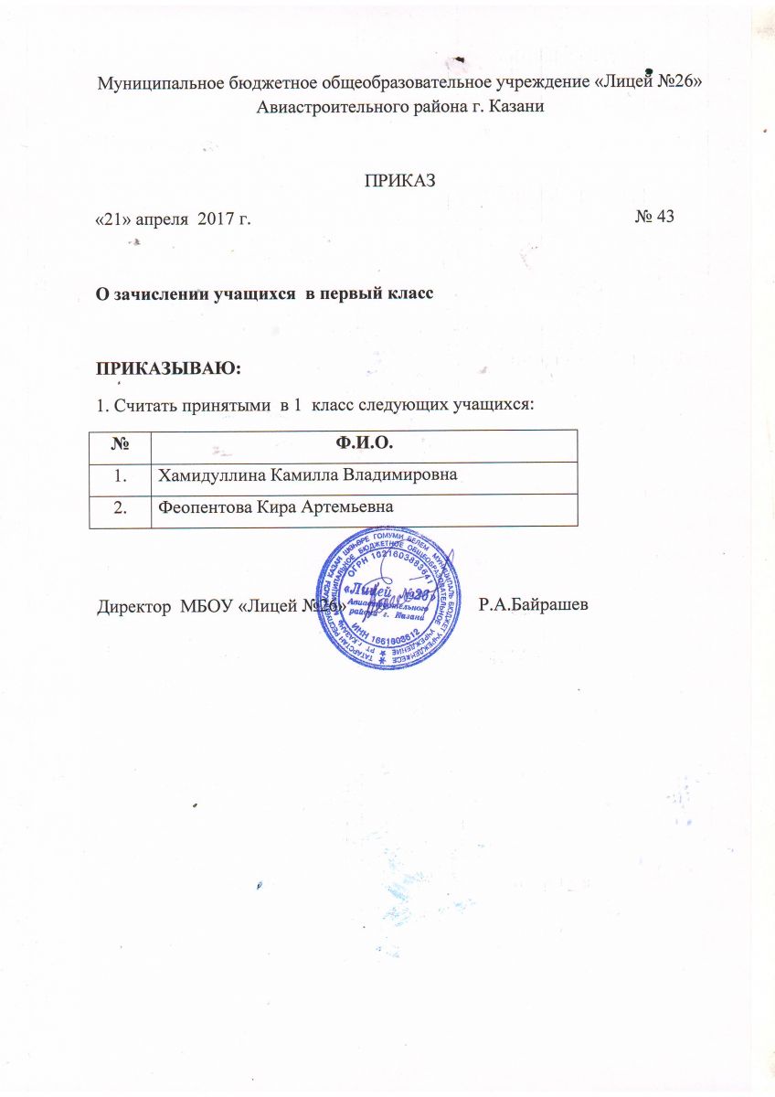 Продолжается прием в первый класс. По состоянию на 21.04.17 приняты еще два учащихся в первый класс, ознакомится можно перейдя по ссылке