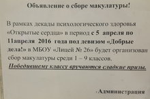 В рамках декады психологического здоровья в лицее в период с 5 до 11 апреля проходит сбор макулатуры. Администрация лицея обещает сладкий приз за наибольшее количество макулатуры!