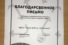 За помощь в проведении Всероссийского экологического урока «Разделяй с нами» лицей получил благодарственное письмо.