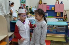 Сюжетно-ролевая игра "Больница" - увлекательный процесс, в ходе которого, происходит полноценное развитие ребёнка. Игра способствут формированию у детей умения играть по собственному замыслу, стимулирует творческую активность, развивает умение вступать в ролевое взаимодействие со сверстниками (строить ролевой диалог, умение договариваться друг с другом в игре); развивает у детей слуховое и зрительное внимание, память, воображение, интонационную выразительность речи; воспитывает дружеские взаимоотношения между детьми, уважение к труду врача. Воспитатель средней группы "Ручеёк" Отина М.Н. помогает детям создавать игровую обстановку.