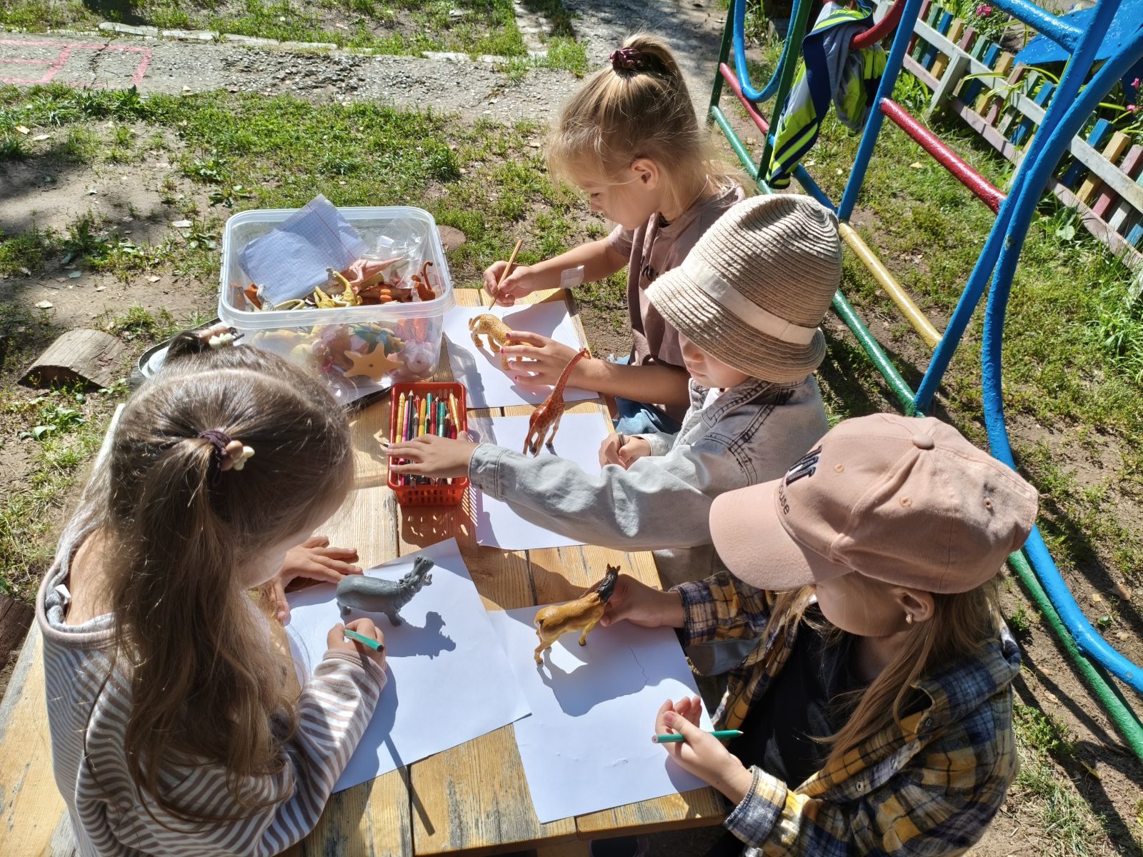 Воспитатель подготовительной к школе группы "Сказка" Кравец Е.Н. на прогулке организовала творческую мастерскую по тени от солнышка.