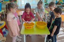 Дети старшей группы "Йодылзлар" с огромным интересом проводят опыты. Сегодня они определяли, какие ткани впитывают воду, а какие не впитывают. Они узнали, что некоторые ткани впитывают, а другие не впитывают. (хлопок, плащёвка). Ткани, которые впитыват воду, можно отжать. Такой вывод воспитанники сделали самостоятельно.