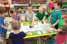 На занятиях по аппликации воспитанники подготовительной к школе группы изображают элементы орнаментов народов Поволжья. Сегодня они изображали элементы удмуртского орнамента на платье, активно и творчески применяли ранее усвоенные способы изображения в аппликации, самостоятельно подбирали цвета, исходя из особенностей колорита удмуртского орнамента.