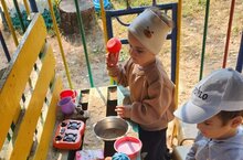 Последние тёплые денёчки позволяют малышам с большим удовольствием играть в домике: варить "обед", угощать "гостей". Именно в игре происходят первые контакты детей друг с другом.