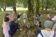 Сегодня на экскурсии в парке наши дети рассмотрели необычный корень клёна, красавицу-рябину с яркими гроздьями ягод. Они бегали на свежем воздухе, были очень весёлыми. А на экскурсию мы отправились на трамвае, что тоже доставило детям огромное удовольствие.