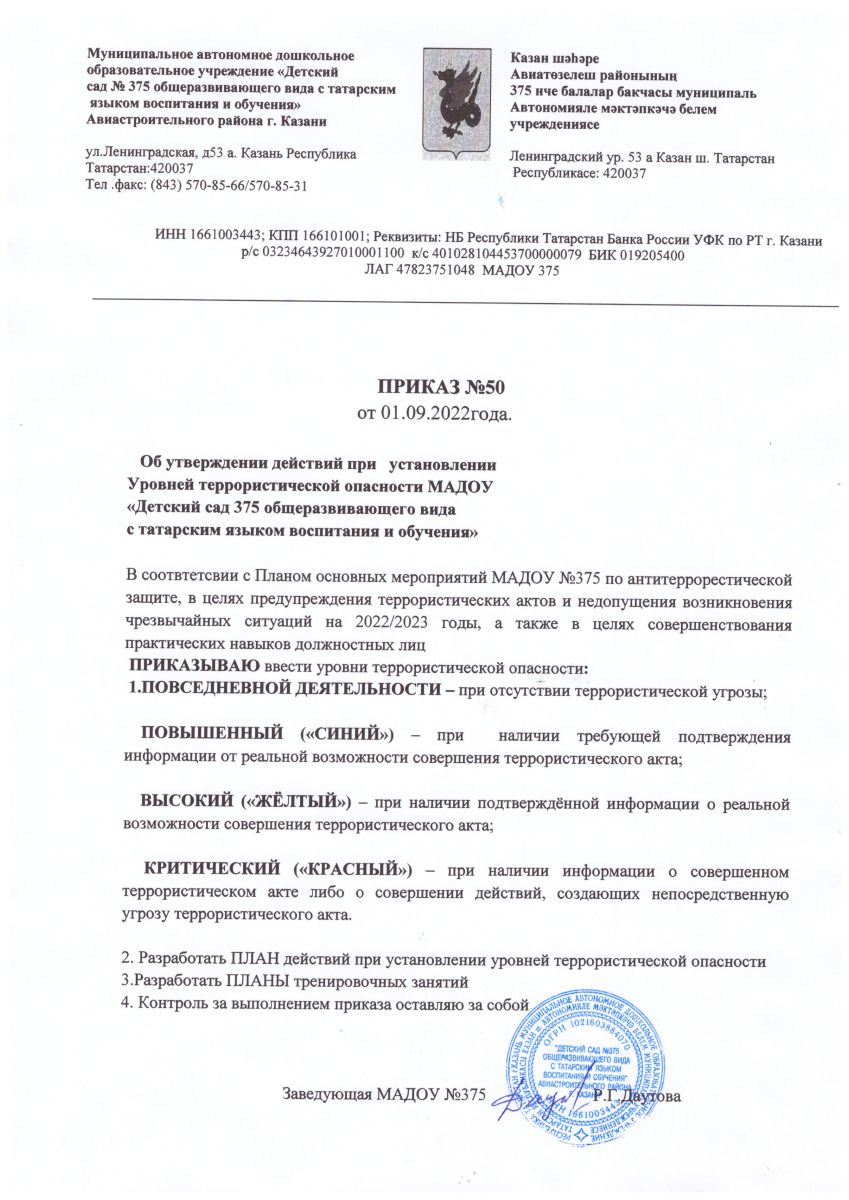 Приказ "Об утверждении действий при установлении уровней террористической опасности в МАДОУ "Детский сад № 375"