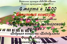 Приглашаем всех желающих на отчетный концерт, учащихся фортепианного отдела "По страницам татарской музыки", который состоится 6 марта в 18.00 в зале ДМШ №11 по адресу: Академика Павлова 25